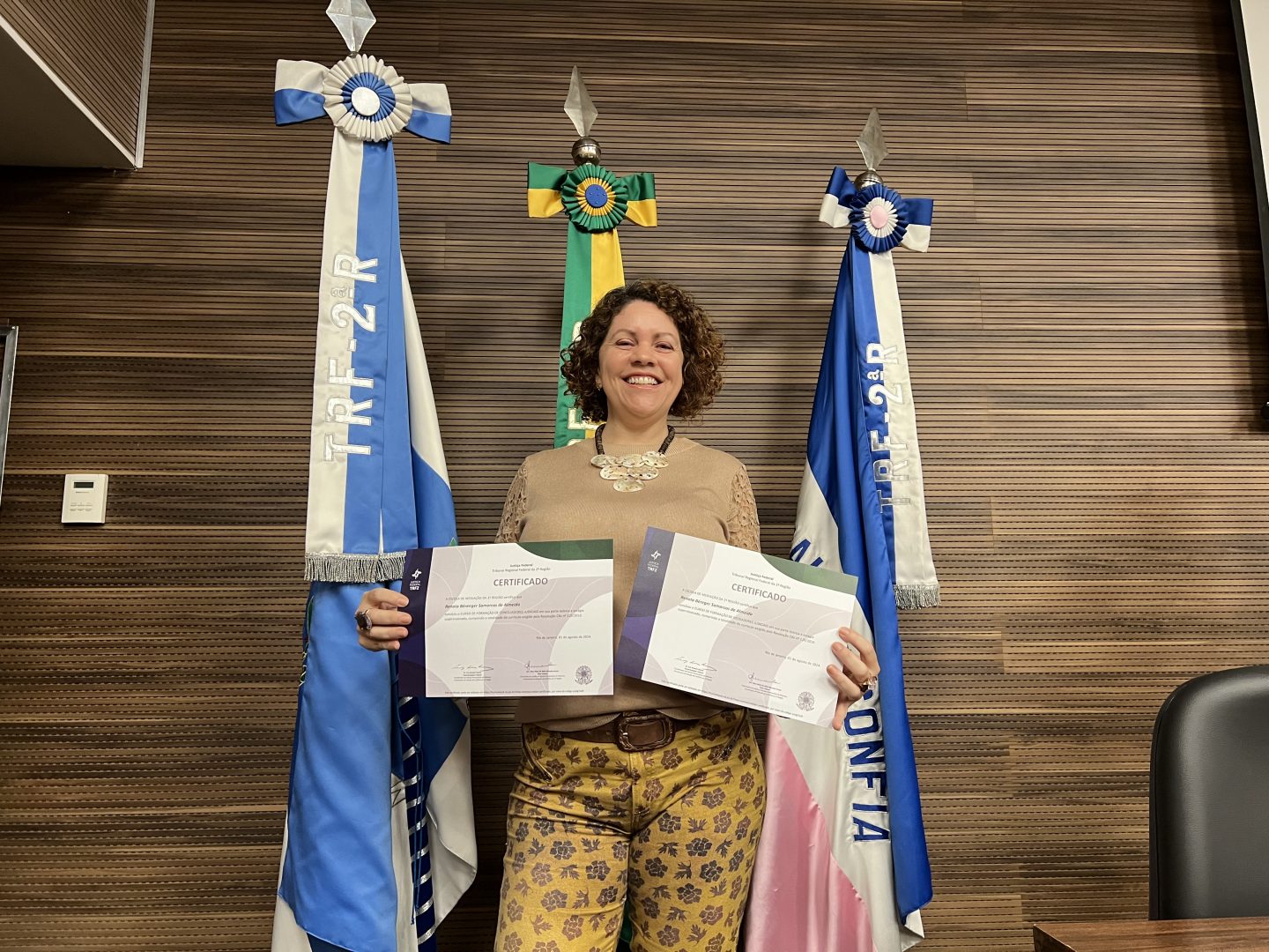 01/08/2024 - Servidora recebe certificados de conclusão de cursos de conciliador e mediador judiciais>